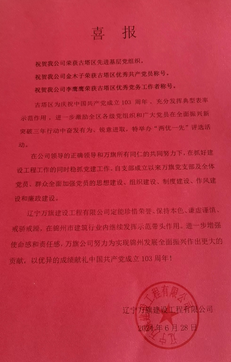 祝賀我公司榮獲古塔區(qū)先進(jìn)基層黨組織